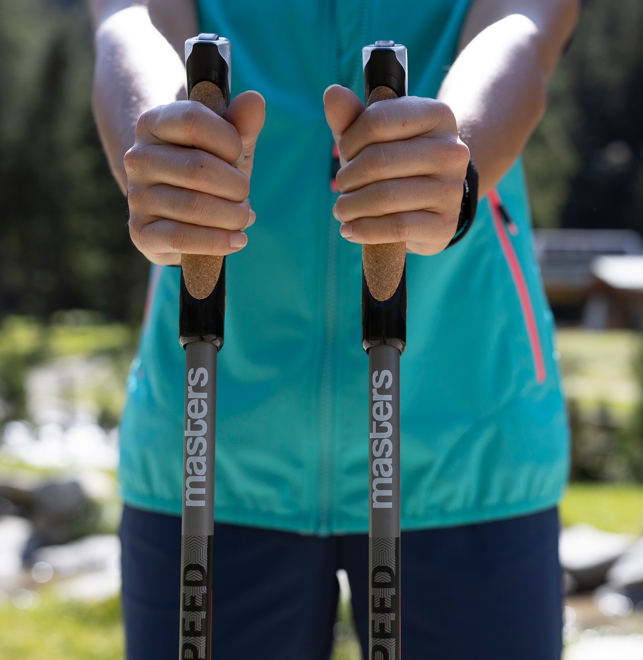 Bastón de nordic walking 2 secciones regulable con empuñadura en corcho Essenza y correa Evolution Réflex de liberación rápida nos brinda un agarre cómodo y seguro. Palo sólido muy resistente y confortable con núcleo AluTech 7075.
