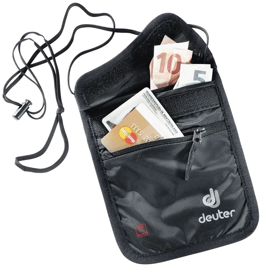 La cartera para llevar alrededor del cuello está hecha de un material suave. La lámina de bloqueo de RFID protege el contenido del robo de datos. Los dos bolsillos con cremallera están optimizados para el dinero y el pasaporte.